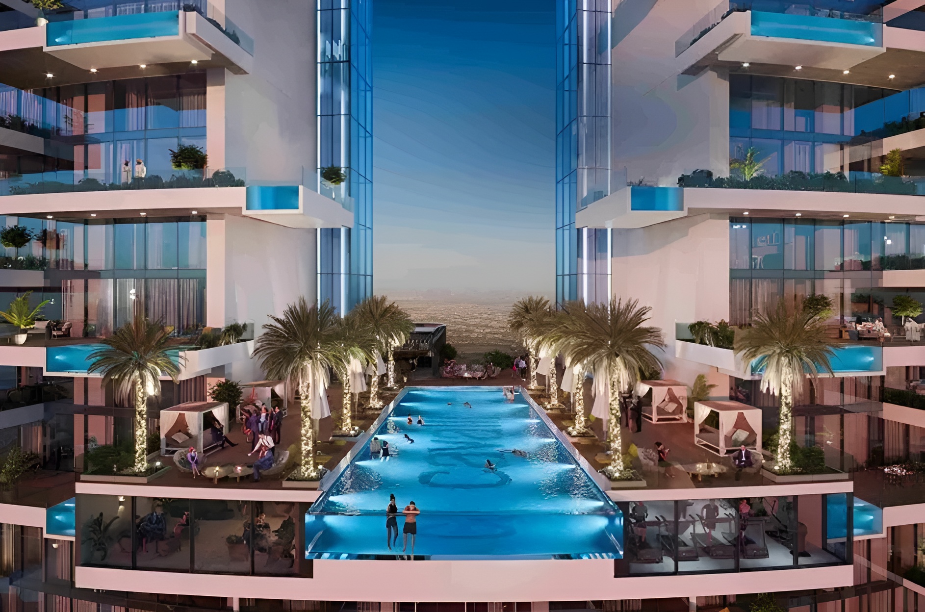 The development features an array of exclusive amenities including a state-of-the-art gym, a rooftop infinity pool, an outdoor cinema, a grand reception area, and an outdoor kids play area—all designed to offer a refined living experience for individuals and families.