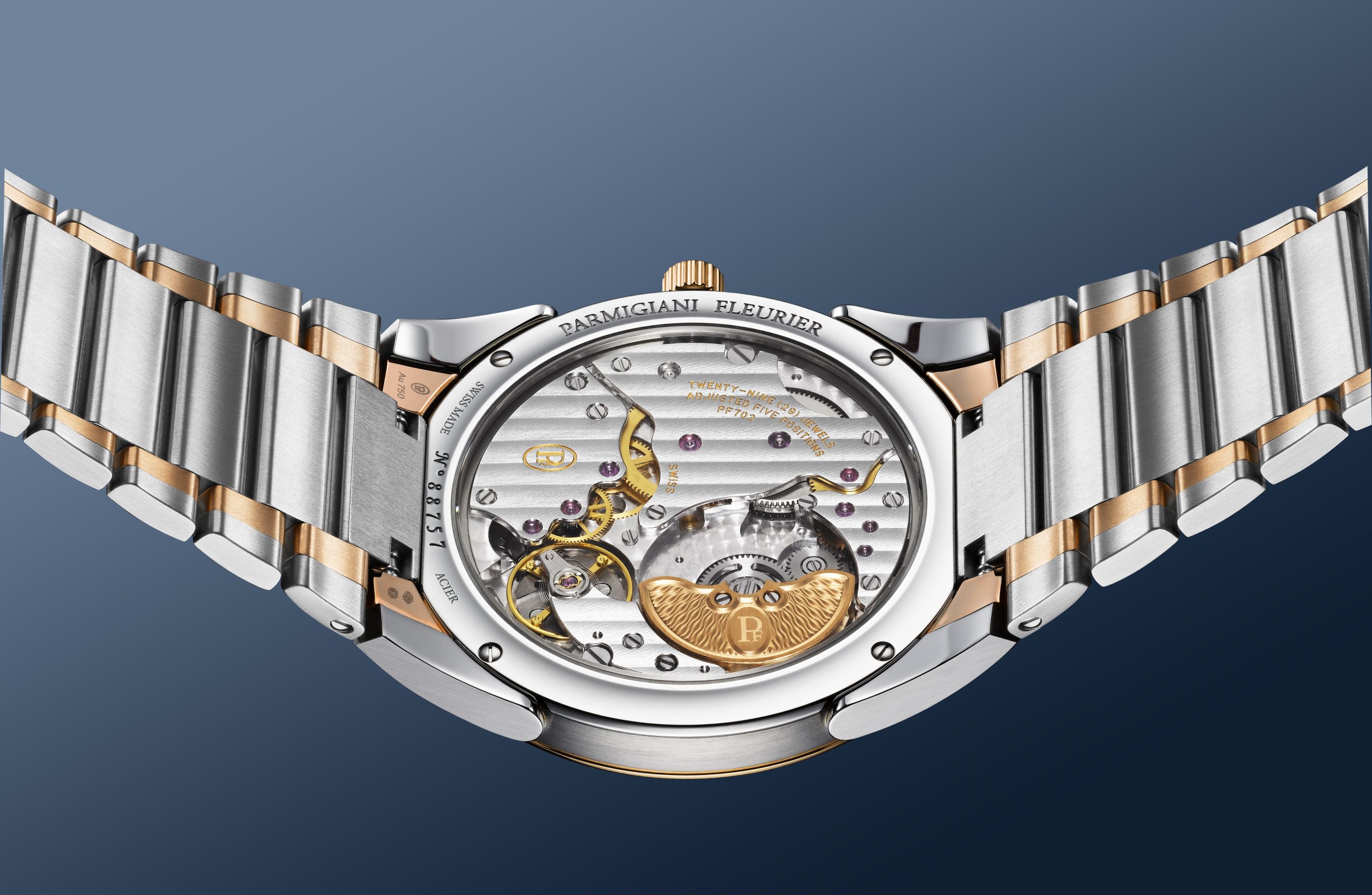 في قلب هذا الإصدار من TONDA PF Micro-Rotor، تنبض الحركة الأوتوماتيكية PF703  المصمّمة بالكامل داخل مشاغل بارميجياني فلورييه، والمزوّدة بروتور متناهي الصغر مصنوع من الذهب الوردي عيار 22 قيراطاً، ومزخرف يدوياً بنمطGrain d’Orge  الرفيع.
