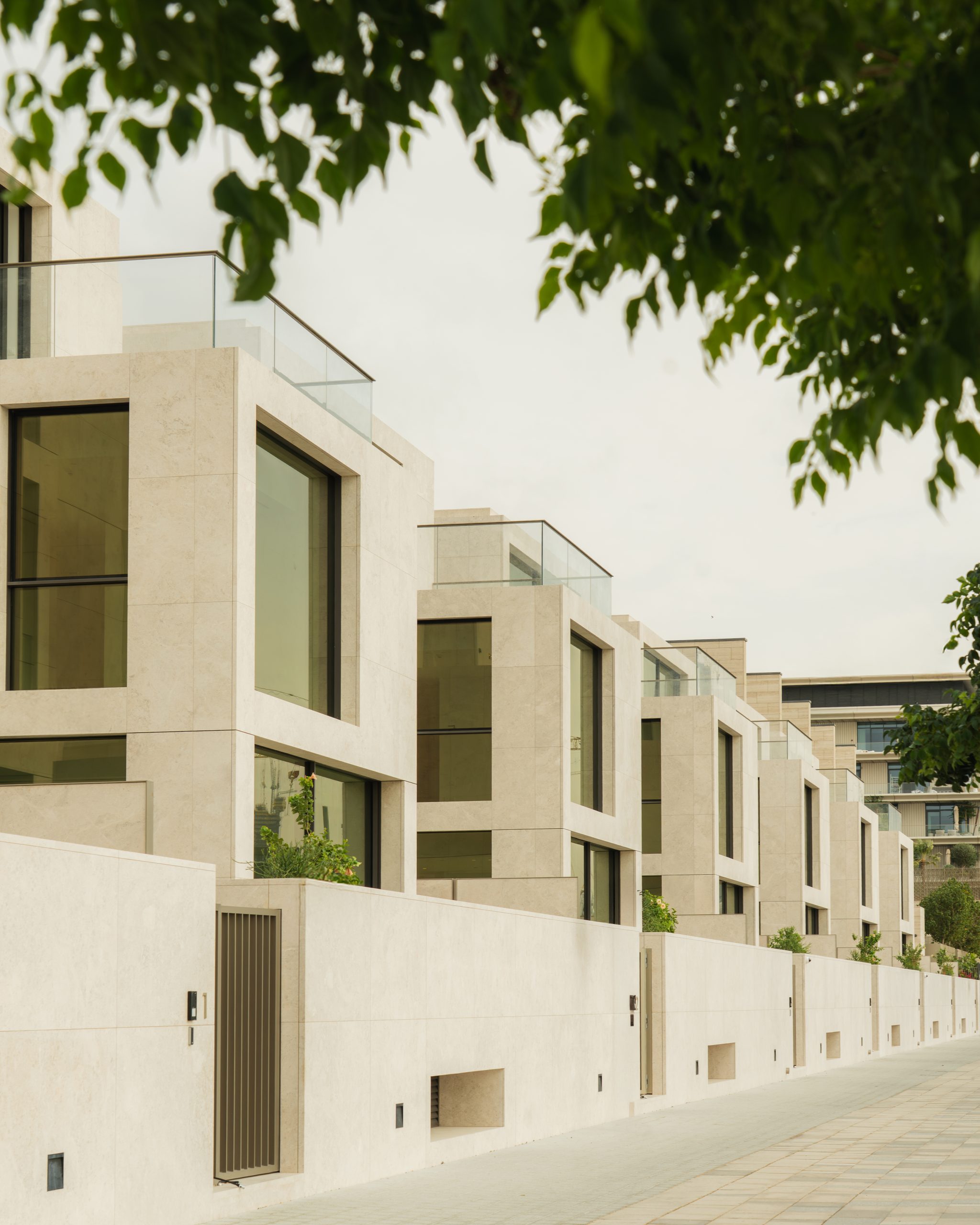 Inside, the interiors follow a monochromatic palette, where light and space are treated as the primary luxuries. The layouts are intentionally open, allowing for a seamless transition between the indoor living areas and deep, shaded terraces that frame views of the canal and the greenery of Jumeirah. Every material, from the honed natural stone to the bespoke joinery, has been selected for its tactile quality and ability to age gracefully, ensuring the homes remain timeless.